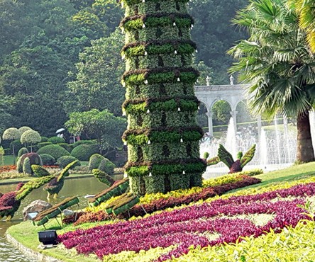 滟湖的水沿中軸線下瀉,使得滟湖成為中軸線的源頭,為了突出這一源頭,園林設(shè)計(jì)者和建造者又在滟湖的岸邊,建一羅馬柱廊,既突出了軸心線上的景點(diǎn)在云臺(tái)花園的作用,又與具有東西合璧特色的花園大門(mén)相對(duì)應(yīng)。版權(quán)所有山東聊城聊之旅國(guó)際旅行社有限公司,轉(zhuǎn)載必究!更為有趣的是,建造者借鑒了蘇州園林中花墻的效果,在羅馬柱廊的后面又安放了一群圖騰石柱。在軸心線的兩側(cè),云臺(tái)大花園分別排列出不同的功能區(qū),200多種中外名貴四時(shí)花卉就被巧妙地種植在不同的功能區(qū)里。東側(cè)在種植各種花卉的同時(shí),還依地勢(shì)起伏培植了大面積的草坪,遠(yuǎn)遠(yuǎn)望去,酷似一條綠色的瀑布。西側(cè)是誼園和茶室。誼園中心是一巨大地球石雕,以地球石雕為圓心,在一個(gè)巨大的圓周內(nèi),分布著已與廣州結(jié)為友好城市的市花和友好城市所在國(guó)的國(guó)花。