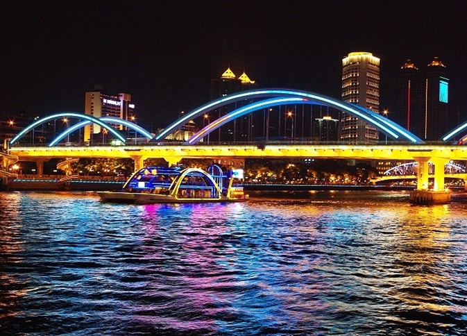珠江包括東江、西江和北江等支流,匯合至廣州河段,景色十分秀麗。入夜,華燈璀璨,"珠江明珠"號(hào)旅游船搭載游客從人民橋附近西堤碼頭出發(fā),向東行駛,經(jīng)解放大橋、海珠橋。江灣大橋、海印大橋、廣州大橋、鶴洞大橋,而后回程。沿途景觀有珠海丹心、東湖春曉、黃埔云檣、鵝潭夜月等"羊城八景",還有南方大廈、愛群大廈、廣州賓館、華廈大酒店、江灣大酒店、二沙海珠廣場(chǎng)花園、白天鵝賓館,沙面洋房建筑等。全程兩個(gè)小時(shí)左右。
