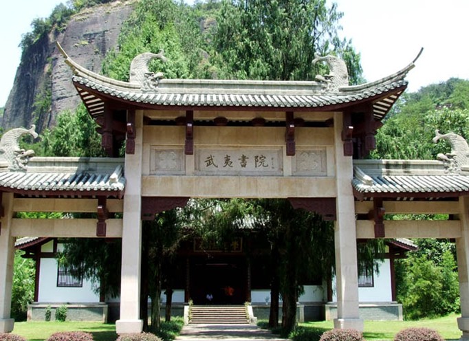 造型莊重、嚴謹的武夷山朱熹紀念館,是一座于1990年落成的廡殿式大院。館內懸掛著新近書寫的匾額、楹聯,其中有不少聯文,語言精練、寓意深長,文彩斐然。古樸的大門上高懸著一塊大匾,題為“朱熹紀念館”五個醒目大字。是方毅同志在武夷山視察時留下的墨寶,莊重、蒼勁,有書法大家的風范。朱熹在武夷山講學40余年,繼承和發(fā)展了理學體系。殿前大門兩側的草書楹聯表達了朱熹繼承和發(fā)展的深邃意義。