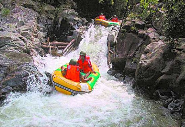 油田礦泉漂流最大的賣(mài)點(diǎn),是其中的高臺(tái)沖水之漂,據(jù)聞屬于首創(chuàng)。漂流水道落差變化莫測(cè),漂流者的橡皮筏在急流中時(shí)沉?xí)r浮,從3米高的水道中飛奔而下,人和筏子沖到水底去了,瞬間又浮現(xiàn)了上來(lái),時(shí)而蜿蜒于峽谷叢林,或漂浮于天光云影之間。