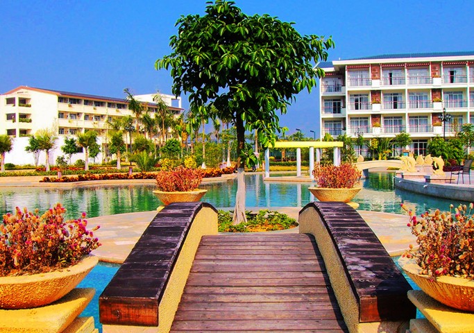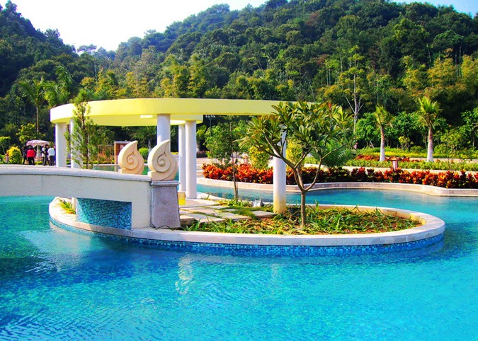度假區(qū)總占地面積為1000畝。其中首期工程占地面積為500畝,其中設(shè)有別墅區(qū)、溫泉區(qū)、餐飲區(qū)、娛樂(lè)區(qū)、健身區(qū)、休閑區(qū)等項(xiàng)目。區(qū)內(nèi)有十分豐富的溫礦泉水資源,溫泉出口處水溫高達(dá)82攝氏度,富含大量鈣、鎂、氡等幾十種對(duì)人體有益的微量元素,對(duì)風(fēng)濕病、腰肌勞損、腸胃病、神經(jīng)性骨痛等多種潛在疾病有顯著療效。目前該度假區(qū)已完成首期工程,并已于2005年9月26日正式對(duì)外接待游客。度假區(qū)內(nèi)綠樹(shù)成蔭,小河流水,小島別墅區(qū)的形狀猶如一把西施扇,把整個(gè)度假區(qū)置身于群山的懷抱中。區(qū)內(nèi)設(shè)施配套齊全,目前設(shè)有575間客房、31棟別墅、三個(gè)中餐廳(同時(shí)可容納1650人)、兩個(gè)西餐廳、歌舞廳、溫泉大浴池、桑拿,以及為顧客提供咖啡廳、茶藝?yán)取⒊?、精品屋、大堂吧、游泳池、桌球室、乒乓球室、羽毛球室、大型的高爾夫練球?chǎng)、網(wǎng)球場(chǎng)、健身房、沐足等各種服務(wù)設(shè)施一應(yīng)俱全。