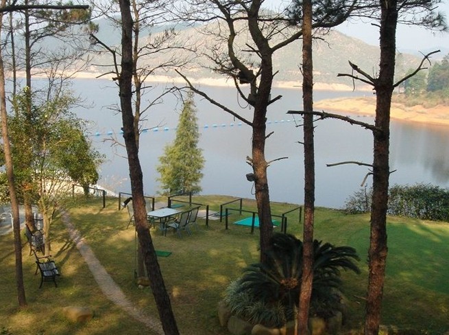 河?xùn)|名人山莊的高爾夫球練習(xí)場就建在湖邊的懸崖上,揮動球桿,小小的高爾夫球成拋物線狀優(yōu)雅地降落在碧綠的湖水里,這種妙不可言的感覺吸引了我們這幫從來沒有接觸過高爾夫球的門外漢。球場旁邊有一片松樹林,林中設(shè)有秋千和吊床,睡在吊床上,靜靜地透過高高的松樹看著潔凈如洗的藍(lán)天白云,只見遠(yuǎn)處山頂一堆蘑菇云慢慢地被風(fēng)吹著一路往山莊方向飄來,由厚變薄、由濃變淡,漸漸地變成羊毛般的云絮,隨著溫暖的春風(fēng)飄舞浮動,直至飄散、消融。在乒乓球臺前、網(wǎng)球場里,經(jīng)過一輪大汗淋漓的運(yùn)動之后,再跳進(jìn)了碧綠的游泳池,一種清涼舒適的感覺必定涌上心頭。