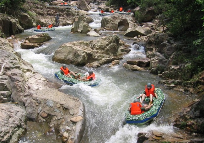 戰(zhàn)船隨著洶涌的河水奔騰而下,峽谷兩側(cè)炮聲隆隆,槍聲不斷,烽煙滾滾,還不時有敵人憑著叢林和怪石作掩護(hù)向我小分隊襲擊。當(dāng)然了,我們勇敢的戰(zhàn)士也毫不猶豫地用手中槍(水槍)予以還擊。在不斷的突破、穿越敵陣的緊張征程中,有著革命樂觀主義精神的戰(zhàn)士們不忘享受穿越激流險灘時的激情澎湃和領(lǐng)略漂浮于平緩流水時兩岸風(fēng)光盡收眼底的詩情畫意。順流而下,四周山巒起伏,奇峰異石;峽谷峭巖跌宕,鬼斧神工;河道石貌多姿,溪水清澈;兩岸林茂竹翠,花香鳥語;沿途飛瀑奇巖,清溪幽泉,組成一幅美妙的大自然圖畫,恍如置身桃花源中,步入人間仙境。版權(quán)所有山東聊城聊之旅國際旅行社有限公司,轉(zhuǎn)載必究!經(jīng)過一個多小時的戰(zhàn)火征程,3.3公里的航程,戰(zhàn)友們感受了大地的歡歌、生命的激情,終于完成了任務(wù)(到了總部終點)。