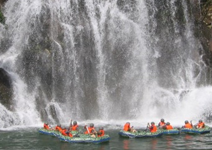 游客一進(jìn)入景區(qū),即置身于戰(zhàn)爭年代硝煙彌漫的烽火氛圍,游客換上專用的野戰(zhàn)軍服,組成一個個戰(zhàn)斗小分隊,在戰(zhàn)斗分隊長(導(dǎo)游)的帶領(lǐng)下,坐上披滿迷彩的運兵車,沿著充滿革命根據(jù)地氣息的曲折而平坦的深山林道向戰(zhàn)地指揮部(起漂點)行進(jìn)。車上,戰(zhàn)斗分隊長向戰(zhàn)友們(游客)布置本次行動的任務(wù),分析敵情,并作宣傳鼓動,領(lǐng)唱戰(zhàn)歌,高叫口號,使士氣空前高漲。經(jīng)過十分鐘的行進(jìn),軍車到了目的地,在響聲震耳的瀑布聲中,更聽到了隆隆的炮聲,密集的槍聲,沿著峽谷峭巖古道而下,到了設(shè)在原始的飛天大瀑布旁邊的戰(zhàn)地指揮部,戰(zhàn)地參謀向戰(zhàn)友們訓(xùn)話并講述了戰(zhàn)斗要點和注意事項(漂流的有關(guān)常識),然后次序坐上戰(zhàn)船順流而下(開始漂流)。