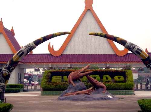 島那金碧輝煌,巍峨壯麗的泰式門樓,門前寬廣的停車場(chǎng)可一次性停放上百輛大巴,進(jìn)入大門后,有一個(gè)十分醒目、高達(dá)4米的大型鱷魚雕像——“鱷魚一家”吸收不少游客紛紛在此攝影留念,離雕像百米處,十多個(gè)鱷魚池座落在鮮花叢中、綠茵地上、池中養(yǎng)有我們祖先稱為“噴火龍”、“鮫龍”的楊子鱷、泰國灣鱷、馬來鱷、雜交鱷等四個(gè)品種.