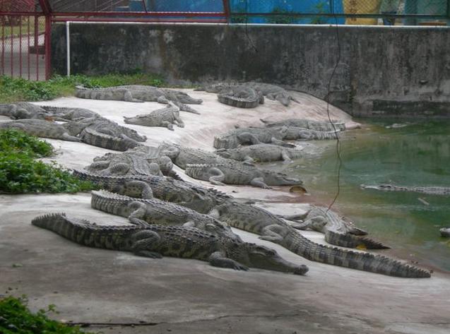 島那金碧輝煌,巍峨壯麗的泰式門樓,門前寬廣的停車場(chǎng)可一次性停放上百輛大巴,進(jìn)入大門后,有一個(gè)十分醒目、高達(dá)4米的大型鱷魚雕像——“鱷魚一家”吸收不少游客紛紛在此攝影留念,離雕像百米處,十多個(gè)鱷魚池座落在鮮花叢中、綠茵地上、池中養(yǎng)有我們祖先稱為“噴火龍”、“鮫龍”的楊子鱷、泰國灣鱷、馬來鱷、雜交鱷等四個(gè)品種,大小近千條,最小的有剛出殼的幼鱷,體型最大的有4米多長(zhǎng),重達(dá)千斤。此外還養(yǎng)有一批鴕鳥、狗熊、孔雀、猴子、大蟒蛇、駱駝、驃頭大馬供游人觀賞、合照,大仿古大炮、踏水車、水上單車等有獎(jiǎng)娛樂項(xiàng)目供游人玩樂。