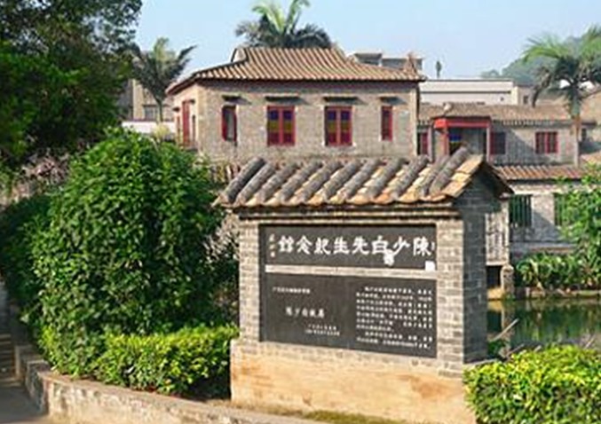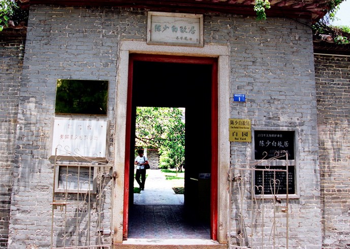位于江門市江海區(qū)外海鎮(zhèn)南華里。由陳少白自行設(shè)計。故居分兩處,隔河相望,以自橋連為一體。橋的一邊是"白園",另一邊是一座"三合院"式的居所。始建于1929年,1931年落成,占地面積兩畝許。自少白逝世后,其家居多旅居外地,樓宇日久失修,漸顯頹敗。1991年春,外海鎮(zhèn)政府撥出巨款?對"白園"和園內(nèi)的"莎蘿坪"、"粥鍋亭"、"瞻云臺"等建筑,以及"三合院"和院內(nèi)的"亞字樓"等都一一進行了修復(fù),并在故居內(nèi)設(shè)立"陳少白事跡陳列館",陳列大量名人字畫及歷史文物。使故居還其原貌,煥發(fā)青春。