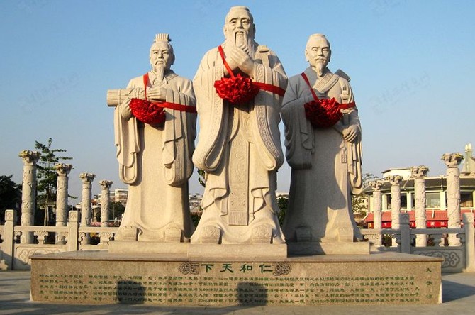 大成殿內(nèi)的四根大石柱上,盤踞著四條木雕巨龍,栩栩如生。據(jù)說這四條龍?jiān)?ldquo;文革”時期曾遭厄運(yùn),差點(diǎn)被化為灰燼,所幸文物工作者將這幾條龍搶回來悄悄藏于地下室。但其中一條龍的頭顱已被燒掉,現(xiàn)在大成殿西南面這條龍的頭部是揭陽籍省級木雕藝術(shù)家郭燕騰先生仿制補(bǔ)上去的。大成殿前天井兩側(cè)分別是東西廡,原為供祀歷代繼承發(fā)掘孔子儒家學(xué)說而較有成就的歷代先儒的牌位。