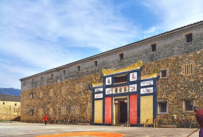 梅州泰安樓的建筑風格獨特,規(guī)模宏大,設計精巧,布局合理,功能齊全,文化內(nèi)涵豐富。從外表上看簡直不相信這會是住宅建筑,其極其封閉的外觀簡直像一座牢不可破的城堡。高大的泰安樓給人的第一印象是磐石般的穩(wěn)重、質(zhì)樸、粗獷。走進泰安樓,以祖堂為中心的“祖功宗德”橫匾,顯示了敬祖的思想和客家人對傳統(tǒng)的依戀,展現(xiàn)了客家人世代相傳和睦共居的獨特的生活方式,這種大家族聚居的建筑體現(xiàn)了客家人的族群意識,泰安樓向心的布局強化了家族內(nèi)部的凝聚力。
