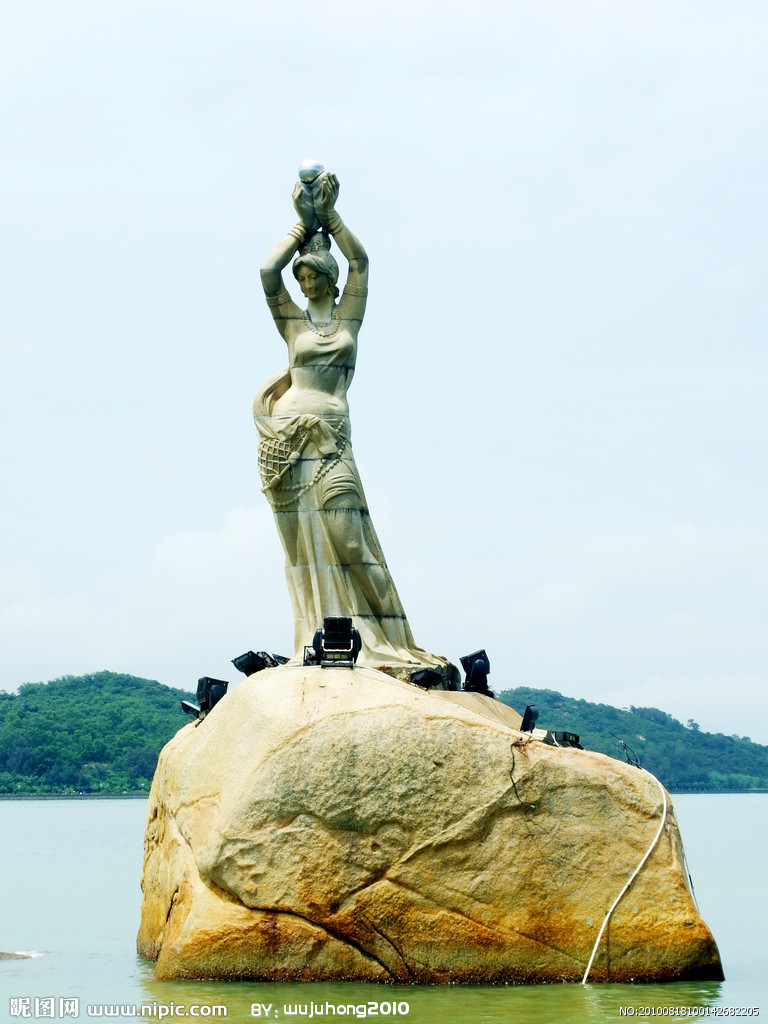 珠海漁女是珠海市的象征,位于珠海風(fēng)景秀麗的香爐灣畔,矗立著一尊巨型石刻雕像——珠海漁女,她領(lǐng)戴項珠,身掮漁網(wǎng),褲腳輕挽,雙手高高擎舉一顆晶瑩璀璨的珍珠,帶著喜悅而又含羞的神情,向世界昭示著光明,向人類奉獻珍寶。