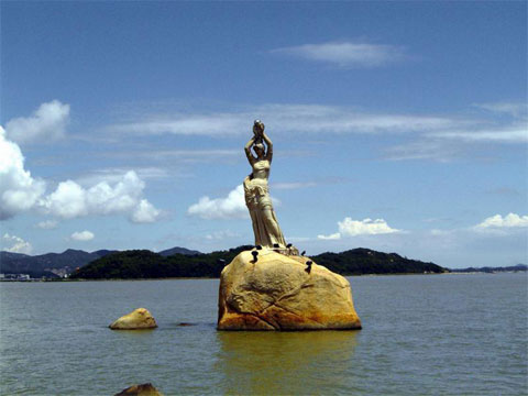 珠海市風(fēng)景秀麗的香爐灣畔,矗立著一尊巨型石雕——珠海漁女,一條美麗整潔的環(huán)海大道——情侶路從她身旁穿過,更使她顯得純潔而大方。她領(lǐng)戴項珠,身掮魚網(wǎng),褲腳輕挽,帶著喜悅而又含羞的神情雙手高高擎舉著一顆晶瑩璀璨的珍珠,獻給德高望重的九洲長老,并向世界昭示著光明,向人類奉獻珍寶。