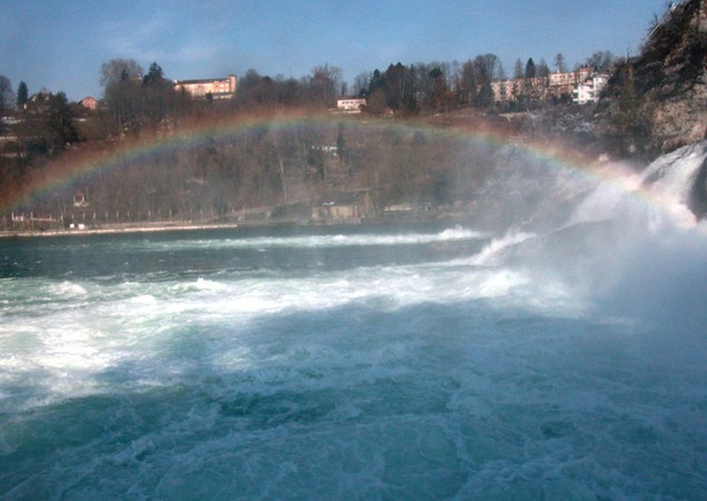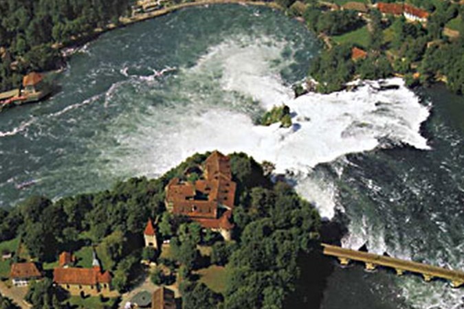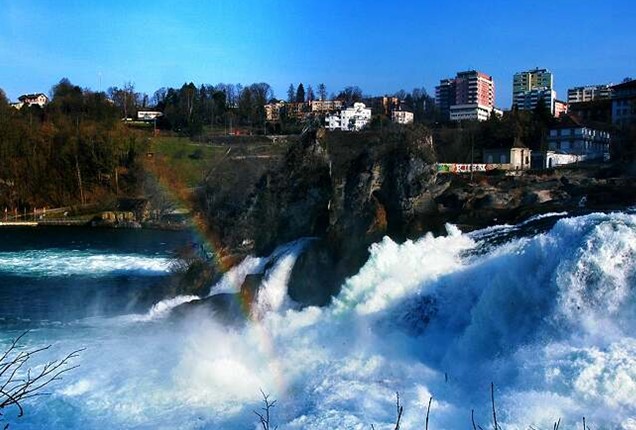 中歐最壯觀(guān)的瀑布,在瑞士北部萊茵河上游。包括一些險(xiǎn)灘在內(nèi),全部落差約30米(100呎),寬150米(492呎)。一塊柱狀巖石把瀑布分成兩個(gè)主要部分,位于河右岸的落差約15米(50呎),左岸約20米(65呎)。