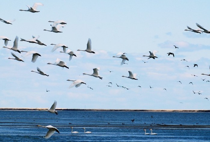 這里湖水清清,水草繁茂,蘆葦蓊郁,一望無際,猶如一條綠色的緞帶,平鋪在呼倫、貝爾兩湖中間。這個綠色的世界象塊巨大的磁場,吸引著眾多鳥類在春天從我國南方、東南亞飛臨這絕妙的世外桃源安家落戶,生兒育女。