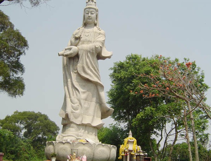 它落成于1994年5月29日,雕藝高超,面容端莊,惟妙惟肖,其左手拿甘露瓶,瓶口向下;右手執(zhí)柳枝,拈露灑人間,形象動(dòng)人。這座高達(dá)12米(含蓮座2米),由總重10多萬公斤108塊石雕砌成,當(dāng)時(shí)是由市工藝美校設(shè)計(jì),惠安縣石雕高手刻后遠(yuǎn)途載來。其左豎一石燈。又有冊(cè)形石板刻著詩僧定持所書二詩,韻妙墨妍。