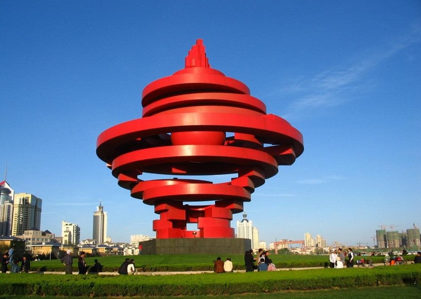 青島市區(qū)東部景區(qū)中具有代表性的是"五四廣場(chǎng)",五四廣場(chǎng)位于市級(jí)機(jī)關(guān)大樓南側(cè),香港路與東海路以南,占地面積十萬(wàn)平方米,因紀(jì)念青島作為“五四運(yùn)動(dòng)”導(dǎo)火索而得名。廣場(chǎng)以東海路為界分為南北兩部分,中軸線上市政府辦公大樓、隱式噴泉、點(diǎn)陣噴泉、"五月的風(fēng)"雕塑及海上百米噴泉,富于節(jié)奏地展現(xiàn)出莊重、堅(jiān)實(shí)、蓬勃向上的壯麗景象,在大面積草坪和風(fēng)景林襯托下,更加生機(jī)勃勃,充滿現(xiàn)代氣息。主體雕塑"五月的風(fēng)"以螺旋上升的風(fēng)的造型和火紅的色彩,充分體現(xiàn)了"五四運(yùn)動(dòng)"反帝反封建的愛(ài)國(guó)主義基調(diào)和張揚(yáng)騰升的民族力量。作品與周圍海天自然環(huán)境以及園區(qū)寧?kù)o典雅、舒適祥和的氛圍有機(jī)地融為一體,形成園區(qū)蔚為壯麗的景觀。