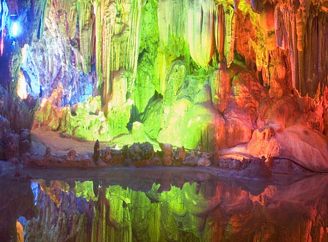 進(jìn)入洞口的第一景就是古佛殿,由石幔、鐘乳石組成的獨(dú)具一格的佛殿內(nèi),三座小石筍錯(cuò)有致,恰似三尊佛像。他們相貌莊嚴(yán)而又安詳,殿內(nèi)佛光普照,令人肅穆。離佛像10米處有一石柱如巨大的古榕,挺撥聳立,枝葉繁茂,被稱(chēng)為 “古榕疊翠”。古榕底下是三五成群的“牧童”牽著“牛群”,踏著斜輝歡樂(lè)而歸。古榕的旁邊還有一個(gè)通天幽洞,大洞疊著小洞,給這美妙的景色又增添了一層神秘的色彩。 穿過(guò)石巷曲徑,便到了觀(guān)音殿。只見(jiàn)一座白色石筍,如一座盛開(kāi)的荷花,花中坐著慈目低垂的“觀(guān)音”菩薩。觀(guān)音旁邊那座石筍象是抱著孩子的送子娘娘。周?chē)鸁o(wú)數(shù)的小乳石就象一群群前來(lái)朝拜的仙人。其中一尊如太白金星在拱手相迎。所有這些形象生動(dòng)地構(gòu)成了一個(gè)“紫竹松林”的境界。在觀(guān)音殿對(duì)面是蓬萊仙島的奇異景觀(guān),蓬萊是傳說(shuō)中的海上仙山,它奇特之處在于海上出現(xiàn)的海市蜃樓景象。這里的景色海天茫茫,空照澄碧,遠(yuǎn)方的海市隱約可見(jiàn),那紅色呈拱狀的地方象是一座城門(mén),里面各式建筑星羅棋布,景象萬(wàn)千。