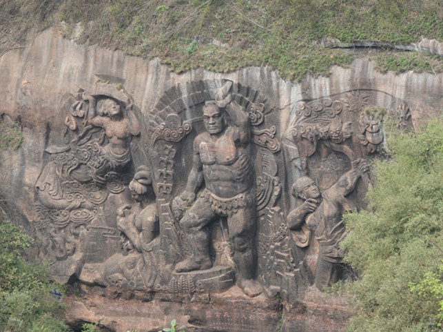 在摩崖峭壁上,以《盤(pán)古開(kāi)天地》、《女?huà)z補(bǔ)天》、《后羿射日除獸》組成我國(guó)神話傳說(shuō)的《華夏魂》,高14米、寬20米的大型摩崖石雕。百步天梯之下,是地勢(shì)隱蔽的狹谷,傳說(shuō)金雞的配偶就選擇這塊地方下蛋,故稱(chēng)蛋谷。母雞把孵出的小雞,一群群地帶往外地安家落戶,繁衍子孫。樂(lè)昌古佛巖的“鷹撲雞群”一景,有人說(shuō)就是它他的后代。登上螺旋梯的頂端,就是“朝陽(yáng)亭”了,何謂朝陽(yáng)亭?就是不論是旭日東升,還是夕陽(yáng)西下,陽(yáng)光總是照射到這個(gè)亭子。