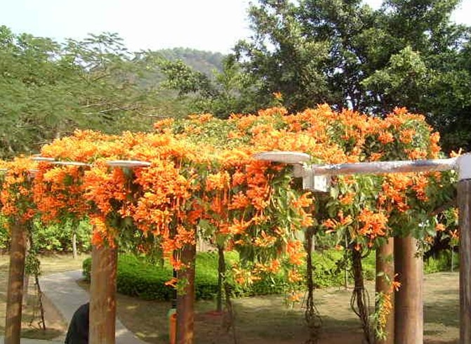 人工疏林草地植被樹(shù)木種類較多,層次較簡(jiǎn)單,林木主要有南洋楹、檸檬桉、白千層、鳳凰木、蒲葵等20多種,林下植物主要以毛杜鵑、龍船花等植物為主;園內(nèi)綠化特色樹(shù)種為美麗異木棉、宮粉紫荊等植物。緩坡地種植的毛杜鵑每到開(kāi)花季節(jié)漫山一片通紅,景色非常優(yōu)美。環(huán)山路邊的二喬木蘭、美麗異木棉,到了開(kāi)花季節(jié)沿路色彩斑斕,自然景觀非常壯麗。“2002-2003年,靠北環(huán)路邊以杉木、馬尾松、馬占相思為主的人工林,由于結(jié)構(gòu)單一,并已老化,已進(jìn)行了林分改造,在保留鴨腳木、山烏桕、野漆樹(shù)等具有景觀效果的野生樹(shù)種,混交配置了鳳凰木、大葉紫薇、火焰木、美麗異木棉、宮粉紫荊、紅花荷等骨干樹(shù)種,形成了層次鮮明,景觀效果高的生態(tài)風(fēng)景林。山脊線主要是以荷木、大葉相思、臺(tái)灣相思組成的防火林帶。”筆架山公園管理處負(fù)責(zé)人向記者介紹,“為給廣大市民呈現(xiàn)多姿多彩的公園景象,我們?cè)?003年沿北環(huán)繞路邊山體種植了彩色林、紫荊花樹(shù),改變公園單一色彩,興建彩色林帶。”現(xiàn)在,公園綠化面積40多萬(wàn)平方米,種植喬灌木5萬(wàn)多株,形成層次明顯、色彩較為豐富的景觀。