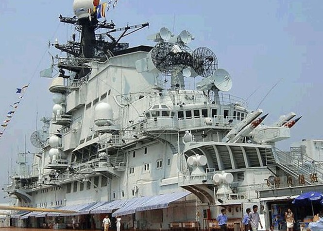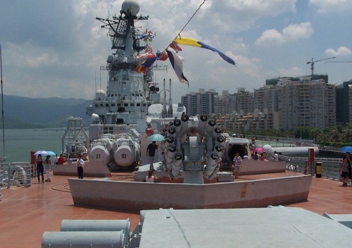 飛行甲板(第一甲板):艦首區(qū)有SS-N-12艦艦導(dǎo)彈,SA-N-3導(dǎo)彈,RBU- 6000反潛深彈,76mm火炮,SUW-N-1反潛導(dǎo)彈;艦橋區(qū)有多種雷達(dá)和電子戰(zhàn)武器;飛機(jī)區(qū)停放著1架前蘇聯(lián)米格-23殲擊機(jī),2架前蘇聯(lián)米-24 武裝直升機(jī)及強(qiáng)-5戰(zhàn)機(jī);艦尾有拖曳式場(chǎng)納1部,艦炮2門(mén);另還有儀仗隊(duì)表演以及艦首高射機(jī)槍等。
