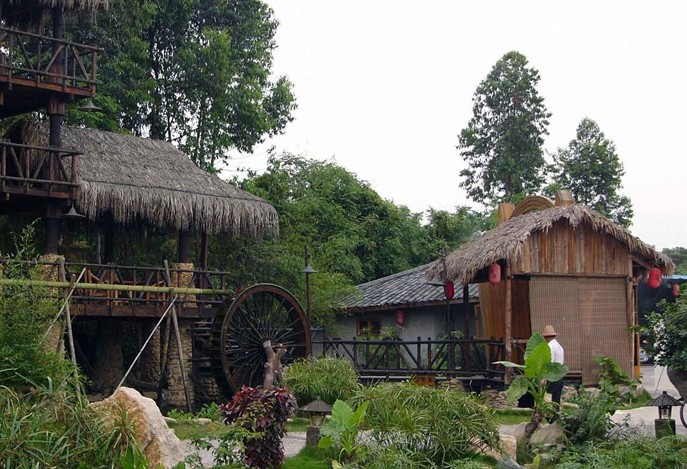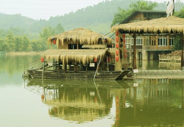 極目莊園方圓幾百畝,百畝水面,風(fēng)平如鏡,或銀波閃爍,或迂回於幽篁之中,或穿行於絲柳之側(cè),亭閣倒影似蜃樓海市,葉葉扁舟如散花點(diǎn)點(diǎn),裝一船歡歌,載一家笑語(yǔ),天倫之樂不亦悅乎!籍田園風(fēng)光之茅屋草寮星羅棋布於全園,皆取法乎自然?;虬?,或依山,或掩蔭於翠竹之下,或深藏於幽徑之中,置身其中,恍若隔世桃源,疑是玉宇瓊臺(tái)。