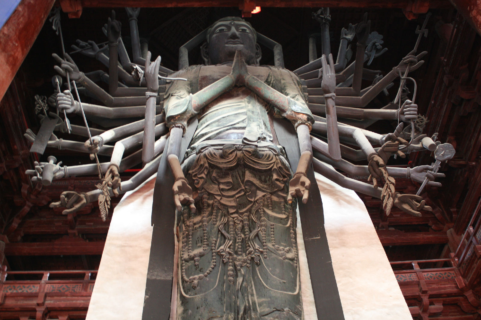 大悲閣是隆興寺的主體建筑,坐落在中軸線後部。閣前古柏參天,閣後老槐吐翠,周圉蒼松、百花環(huán)繞,景色清幽宜人。閣高33米,面闊七間,進(jìn)深五間,為五重檐三層樓閣。舊名“佛香閣”、”天寧觀音閣”。據(jù)記載,該閣始建于968-976年(宋初開寶年間)。大悲閣內(nèi)矗立著一尊高大的銅鑄大菩薩,稱“大悲菩薩”,高19.2米,立于2.2米高的須彌石臺(tái)上,是中國保存最高的銅鑄觀音菩薩像。像奉宋太祖趙匡胤敕令而造,周身有42臂,又稱“千手千眼觀音”。各臂分持日月、凈瓶、寶塔、金剛、版權(quán)所有聊城聊之旅國際旅行社有限公司,轉(zhuǎn)載必究!寶劍等,可惜兩側(cè)4o雙銅手臂均被毀,已改為木制,僅前胸兩臂為原鑄。觀音像神態(tài)自若,比例均勻,衣紋流暢,線條細(xì)膩,頗具宋代藝術(shù)風(fēng)格。據(jù)寺內(nèi)一通宋碑記載,其鑄造程序是:先鑄好基礎(chǔ),然后分七節(jié)鑄造大菩薩。第一節(jié)鑄下部蓮花座,第二節(jié)鑄至膝蓋,第三節(jié)鑄至臍下,第四節(jié)鑄至胸部,第五節(jié)鑄至腋下,第六節(jié)鑄至肩膊,第七節(jié)鑄至頭部。最后添鑄四十二臂。菩薩的手均為木雕而成,其上裹布,一重漆,一重布,然后用金箔貼成。