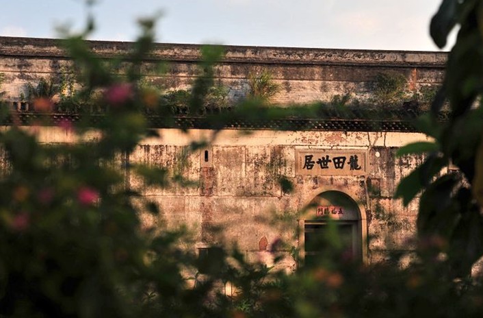 圍屋坐北向南位于花園中間,圍屋外兩側(cè)傍河處各建有一排房子,圍屋前有寬敞的曬谷場(chǎng)及與圍河相通的池塘。整座圍屋四周壁立、高不可攀,大門(mén)上有一門(mén)額,上刻:“龍?zhí)锸谰樱拦馐吣甓∮蠚q仲夏谷旦雋卿建立。”據(jù)坑梓街道文體服務(wù)中心副主任魏英女士介紹,墻上的對(duì)聯(lián)“龍門(mén)得意揭春榜,版權(quán)所有山東聊城聊之旅國(guó)際旅行社有限公司,轉(zhuǎn)載必究!鳳詔新頒建立田”,寓意著龍?zhí)锸谰用值膩?lái)歷。從對(duì)聯(lián)字意來(lái)看,當(dāng)初黃氏家族十分重視教育以及人才的培養(yǎng)。圍屋四角及北面正中設(shè)有四層樓高的炮樓,炮樓間連以跑馬廊,使圍屋顯得氣勢(shì)恢宏。