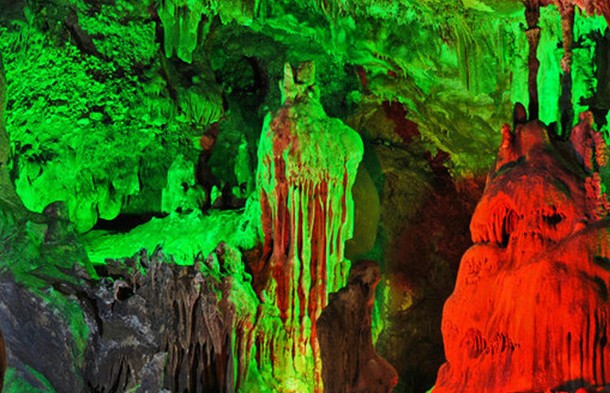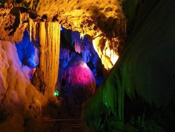 蟠龍洞的特殊景觀有三外:其一是世界三大石花洞之一。洞內石花剔透玲瓏,晶瑩如玉,它附著于巖壁之上,不按重力方向生長,版權所有山東聊城聊之旅國際旅行社有限公司,轉載必究!而向四面節(jié)節(jié)開花,見氣成石,繼續(xù)生長,變幻無窮。其二是我國南方典型的大熊貓--劍齒象動物群"古動物化石區(qū)",最為珍貴的是"智人"古人類化石。其三是蟠龍洞尚未開發(fā)的龍泉地下河,河中有泉眼,每隔十分鐘左右,泉眼波浪翻滾,似海潮洶涌,沖刷河岸,隨后又似退潮,靜靜地回流石洞,經專家確認為地下間歇泉,是一罕見洞府奇觀。洞長千米,深暗幽邃。里面有高達30米的螺頂,有深不見底的石罅,寬闊空曠處都能容千人,窄處不能2人并行。在洞內跺腳砸壁會發(fā)出“嗡嗡”回音,給人一種神秘莫測的感覺。洞口朝南,為券拱門,門上坎刻“龍洞熏風”四個篆字,為康熙14年5月立。洞內10米處,有一供臺,臺上神像已廢,只剩臺下殘存的幾尊羅漢石像身軀。向洞內行至30米處,開始向右下方拐彎,回頭外望,只見洞口猶如月牙出山,人稱“回首望月”。繼續(xù)前行,步步廳景。鐘乳石形成的“火燒葡萄架”含珠點翠;石壁上被浸蝕成的“仙人炕”形體逼真;巨石橫貫的“仙人橋”奇特驚險,世間罕見。再向里進,八戒可見鐘乳石形成的“江豬探海”、“水簾瀑布”、以及多年沖刷而成的“姜池”、“藕池”,池內形似鮮姜的鐘乳石如霞似錦。“蓮藕”如雪似玉。“玉龍騰空”尤惹人注目:在高達20米的洞壁上,有一塊鐘乳石,宛若玉龍,通體覆蓋著銀光閃爍的“龍鱗”,妙不可言;龍頭垂下,嘴里噴球吐玉人,人稱“龍滴水”,滴在下面“蓮花盆”里,四時不涸。“鷂子翻身”是洞內向下延伸的地方,此處游人不能正面行進,必須翻過身子,雙手攀石倒行;路旁有深不見底的石罅。走過險境,是一段空闊平坦的地帶,版權所有山東聊城聊之旅國際旅行社有限公司,轉載必究!這兒路面干燥,清風習習。再向里前進,便是“倒爬四十步”,雖然路程難走,卻另有一番意境。再向前行200米,有巨石擋堵,不能前往。洞口外200米處為金代佛隱寺遺址,存戲臺和石碑1通、古柏1株。漫山蒼松翠柏,郁郁蔥蔥;山下溝壑幽深,樹林茂密。