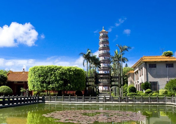 于明萬(wàn)歷四十一年(1613年)元月興工,至萬(wàn)歷四十三年(1615年)四月落成。初命名“文魁塔”,又稱(chēng)“啟秀塔”。后因挖塔基時(shí)發(fā)現(xiàn)蛇卵三只,以以為是“三元及第”之兆,故改名為“三元塔”。在380多年前建筑工具簡(jiǎn)陋的情況下,雷州人民僅用約兩年時(shí)間就建成一座如此雄偉壯麗的高層古塔,至今已經(jīng)經(jīng)歷了將近400年的風(fēng)雪滄桑,雷轟地震仍巋然屹立,充分顯示了雷州人民的聰明才智和驚人的創(chuàng)造力。此塔坐東向西,樓閣式磚木結(jié)構(gòu),用棱角牙子磚和線磚互相疊澀出檐,下大上小,逐層遞減,比例勻稱(chēng)。檐上有平臺(tái)、外廊,繞以欄桿。八觚九級(jí)、內(nèi)樓17層、高57米。塔基為石刻須彌座。八面共嵌有23塊陽(yáng)雕石刻,分別為“麟趾呈祥”、“鯉跳龍門(mén)”、“獅子戲球”、“三羊(陽(yáng))開(kāi)泰”、“雙鳳朝陽(yáng)”、“喜鵲練梅”等,線條粗獷,形態(tài)生動(dòng),富有民族特色和地方風(fēng)格,為明代石刻珍品。每層設(shè)真、假門(mén),呈圭角形。真門(mén)對(duì)開(kāi)相連通,利用塔壁為階梯由下而上,穿過(guò)塔心室,繞平座(塔廊)、南入北出、東進(jìn)西升、盤(pán)旋而上,可達(dá)極頂。三元塔建成后,雷郡形勝大為改觀,“鼎峙瓊南添一指,聯(lián)翩雁字豫題名”。 版權(quán)所有山東聊城聊之旅國(guó)際旅行社有限公司,轉(zhuǎn)載必究!后來(lái)“雁塔題名”成為雷陽(yáng)八景之一。古往今來(lái),不少騷人墨客、名宦顯貴慕名登臨,留下不少膾炙人口的詩(shī)文,其中明代海北南守道蔣光彥(福建晉江人,進(jìn)士)有詩(shī)贊道: