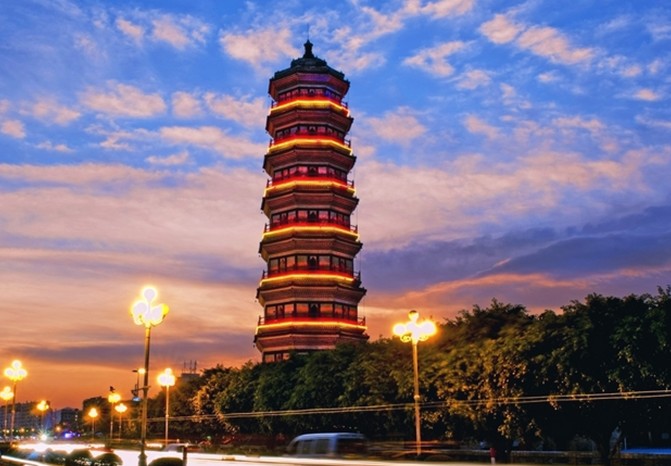崇禧塔始建于明萬(wàn)歷十年(1582年)九月,由嶺西副使王泮興建,萬(wàn)歷十三年(1585年)四月竣工。因西江水“滔滔而東,其氣不聚,人才遂如晨星”,若建塔聚 氣,可使人才輩出;又因西江水患頻仍,建塔可鎮(zhèn)住“禍龍”,永固堤圍,于是有造塔之舉。而塔名,則取“文運(yùn)興旺”、“鴻福無(wú)疆”之意。它屹立于塔腳路北側(cè) 的石頂崗上,巍峨壯觀,氣勢(shì)非凡,堪稱四塔之冠。崇禧塔 位于肇慶市塔腳路石頂崗??拜浖艺J(rèn)為西江水“滔滔而東,其氣不聚,人才遂如晨星”,若在石頂崗建塔,可使人才輩出。塔外觀比例均勻協(xié)調(diào),每層塔檐均用綠色琉璃瓦鋪蓋,檐角懸掛風(fēng)鈴,鈴聲嘹亮悅耳,塔腔內(nèi)底層至五層砌有佛龕,過(guò)去,龕內(nèi)供奉泥塑佛像。從乾清門進(jìn)入塔內(nèi),循級(jí)登塔,左右盤旋,每至平座,可憑欄遠(yuǎn)眺,四周景物,盡收眼底。塔剎用鐵鑄的覆盆、寶珠、紫銅葫蘆裝置,金碧輝煌。塔為樓閣式磚塔。為八角九級(jí),內(nèi)17層,高57.5米?;鶠槭?,高1.84米、周長(zhǎng)46.5米。其八角均有石雕“托塔力士”。力士像之間有二龍戲珠、鯉躍龍門、雙鳳朝陽(yáng)、麒麟獻(xiàn)瑞等浮雕。該塔比例勻稱,自下而上逐層減高與收分。每層腰檐用琉璃瓦鋪蓋,檐角懸掛銅風(fēng)鈴,共72個(gè)。塔樓板為木質(zhì),各層平座均有木護(hù)欄。底層至五層均有佛龕,其中首層外3個(gè),二至五層明、暗層共46個(gè)。各層門洞為圭形券門,版權(quán)所有山東聊城聊之旅國(guó)際旅行社有限公司,轉(zhuǎn)載必究!由西北方向的乾清門進(jìn)入塔內(nèi),逐層穿壁繞平座盤旋直至頂層。1960年和1983年該塔進(jìn)行維修,恢復(fù)了樓板、平座、瓦檐、欄桿等,并增建外圍墻。由趙樸初撰書“崇禧塔”匾和“七星高北斗,一塔聳南天”的對(duì)聯(lián)鑲嵌于山門之上。1962年7月廣東省人民委員會(huì)公布為文物保護(hù)單位。