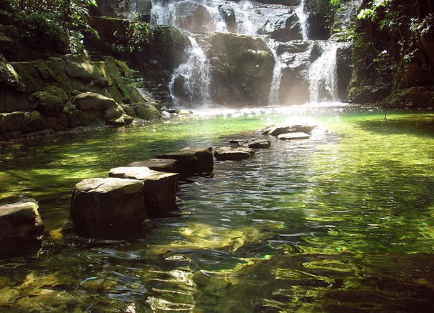 鼎湖山飛水潭,又名龍?zhí)讹w瀑,位于鼎湖山南半山腰、慶云古剎下東側。 去飛水潭,由榮睿碑亭拾級登山,沿曲徑云封直上,至半山腰向右拐,過眠綠亭即可。當然,亦可在榮壑碑亭前面的山溪邊起步,一直溯溪而上。這里,山石嶙峋,瀑布從40多米高的崖頂深處狂奔而來,直往下飛瀉,忽而形成千尺飛流,如白練懸空,忽而濺作滿空雨花,如輕紗曼舞。瀑布下,如注的水流匯成一泓碧水,中有巨石,上刻“枕流”2字。辛亥革命后,孫中山先生偕夫人宋慶齡游覽鼎湖山時,曾在此游泳,現(xiàn)崖壁上刻有宋慶齡手書的“孫中山游泳處”6個大字。潭水由此再往下傾瀉,繼而形成另一個深潭,據(jù)傳為蟄龍窟,故曰:浴龍池。 飛水潭側建有更衣室,崖間建有觀瀑亭,崖壁鐫刻著許多贊美飛水潭的摩崖大字和方寸小楷,如“噴雪”、“能移我情”、“天然圖畫”、“飛泉咽危石”等,頗有詩情畫意。 夏日到此,觀瀑、游泳、濯足,均感遍體清涼,煩熱頓消。