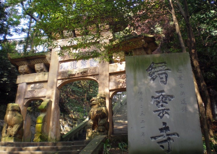 縉云山是具有1500多年歷史的佛教勝地。山中縉云寺,始建于南朝劉宋景平元年(423年),后曾稱“相思寺”、“崇勝寺”、“崇教寺”,受到歷代帝王封賜。寺中自古辦學(xué),名為“縉云書院”。寺內(nèi)現(xiàn)存有宋太宗誦讀過的24部梵經(jīng)。寺外石照壁上“豬化龍”浮雕,為六朝文物。另有出土的石刻天王半身殘像,據(jù)傳是梁或北周作品。唐高祖李淵(618年)曾親筆題名“禪真宮”,唐大中元年(847年),宣宗皇帝賜寺額為 “相思寺”,系山有相思巖、相思竹、相思鳥之故。唐乾符元年(874年),定濟(jì)和尚重建寺廟,971年慧歡禪師主持修葺殿宇。998年,宋真宗將太宗讀過的梵經(jīng)240卷送到這里,供奉在寺中。宋景德四年,真宗賜名“崇勝寺”。明永樂五年成祖皇帝敕諭“縉云勝景”,明天順元年(1462年)英宗皇帝又踢名“崇教寺”,萬歷三十年神宗皇帝下令改為縉云寺,賜題“迦葉道場(chǎng)”。明末清初,寺毀于火災(zāi).傳說是因?yàn)楫?dāng)時(shí)寺內(nèi)和尚,橫行四鄰,當(dāng)?shù)乩习傩蘸拗牍牵脧埆I(xiàn)忠入川時(shí),聚眾上山一把火把寺燒毀,現(xiàn)存的寺廟是清康熙二十二年(1683年)由破空和尚主持修復(fù)的。1930年秋,曾任世界佛學(xué)苑苑長(zhǎng)、中國佛教學(xué)會(huì)會(huì)長(zhǎng)、中國佛教整理委員會(huì)主任的太虛大師(1889-1947)“游化人川”,得知四川劉湘有“選派漢人入藏”之意,乃建議成立漢藏教理院,以研究漢藏教理,融洽中華民族,發(fā)揚(yáng)漢藏佛學(xué),增進(jìn)世界文化交流,得到了渝州(今重慶)軍、政、金融界知名人士的大力支持,遂選定縉云寺作校址,推選劉文輝為名譽(yù)院長(zhǎng)、太虛為院長(zhǎng)、何北衡為院護(hù),共同組成漢藏教理院董事會(huì)。該院辦學(xué)20年,為我國培養(yǎng)了大批佛教人才。當(dāng)年學(xué)生現(xiàn)遍及世界各地,重慶佛教協(xié)會(huì)會(huì)長(zhǎng)惟賢法師等均是太虛法師的學(xué)生。縉云寺漢藏教理院號(hào)稱世界佛學(xué)苑四大分院之一。寺內(nèi)大雄寶殿上塑有迦葉古佛,高約2米。兩旁站立帝釋、梵天,都是清代塑像。其外有一匾額,上書“曇花藹瑞”。寺內(nèi)還有一口大鐵鐘,高約1.60米,底徑1.50米,腰徑0 9米,為清道光二年(1822年)所鑄。山門外,兩棵參天銀杏直向青天,古剎鐘聲與山間松濤相映成趣。寺內(nèi)的雙柏精舍為方丈居室,兩側(cè)禪房與石刻,形成古色古香的意趣。在寺 外,還存有世界佛學(xué)苑漢藏教理院碑記及太虛法師和正果法師塔各一座,上有趙樸初和鄧穎超的親筆題字。
