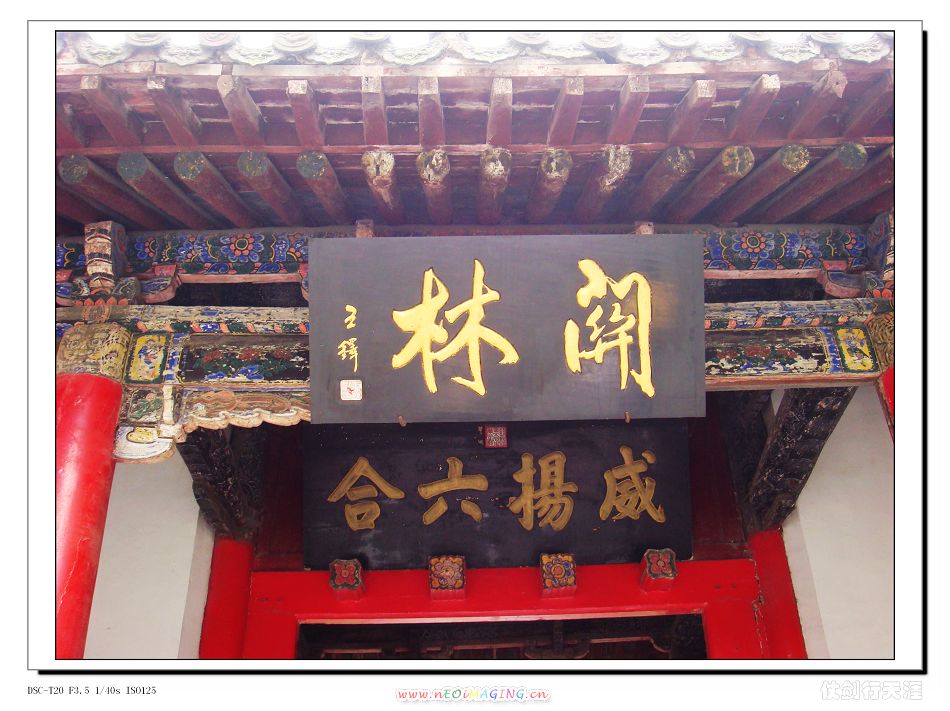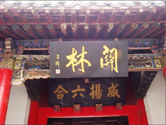 始建于明萬歷二十四年(1596年),面闊七間,進深三間,高26米。廡殿頂,琉璃瓦覆蓋,五脊橫立,六獸揚威。正門上,有12幅明代浮雕木刻。說的是桃園三結(jié)義,三英戰(zhàn)呂布等故事。