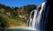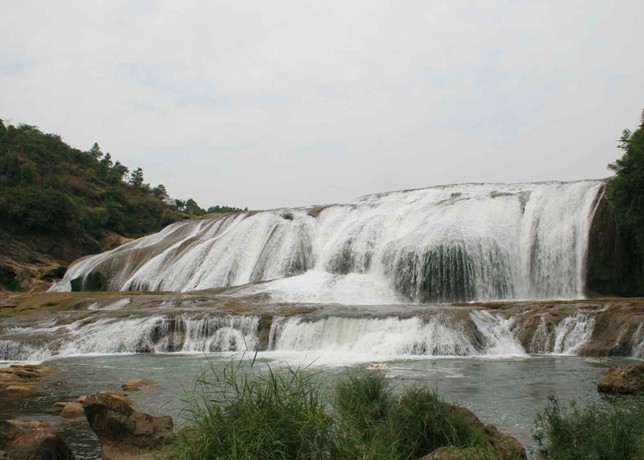 陡坡塘瀑布位于貴州省黃果樹瀑布上游1公里處,瀑頂寬105米,高21米,是黃果樹瀑布群中瀑頂最寬的瀑布。陡坡塘瀑布頂上是一個面積達1.5萬平方的巨大溶潭,瀑布則是形成在逶迤100多米長的鈣化灘壩上。陡坡塘瀑布還有一個特殊的現(xiàn)象:每當(dāng)洪水到來之前,瀑布都要發(fā)出“轟隆。轟隆”的吼聲,因此又叫“吼瀑”。