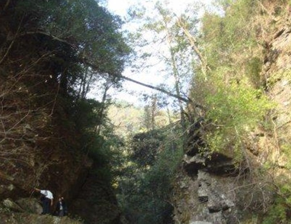 虎口峽內,立在石上,舉頭仰望,只見懸?guī)r上沖下一條“大白鏈”,洶涌奔騰,聲震山谷,正如元代汪克寬寫的詩句:“翠巖懸瀑鏘瓊瑤,雷霆霹靂轟云霄”那般壯觀,這就是峽谷中有名的龍泉瀑布。