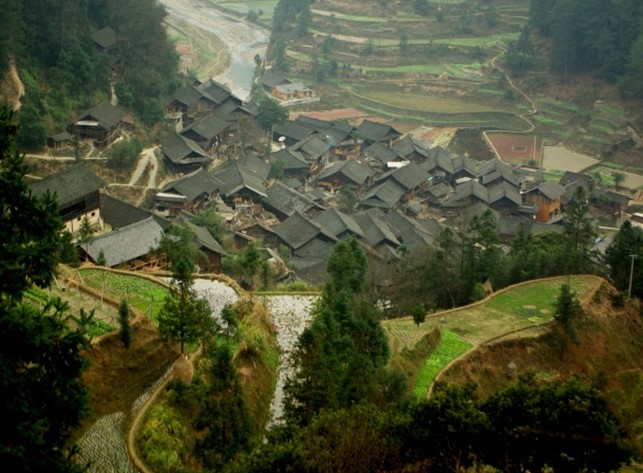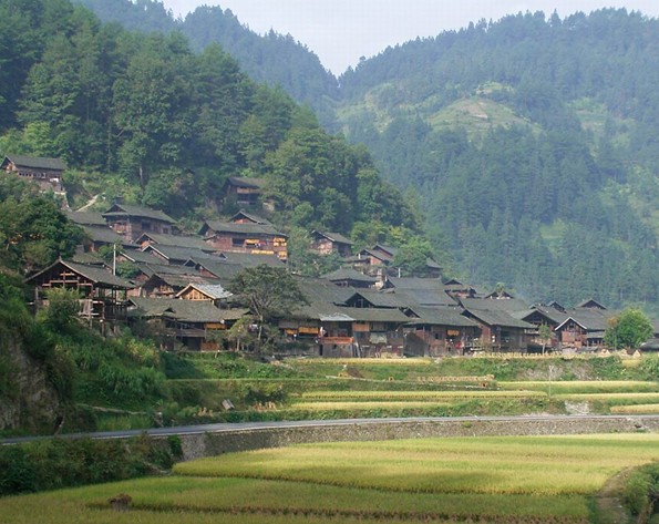 朗德上寨,屬貴州省黔東南苗族侗族自治州雷山縣報德鄉(xiāng),是一個苗族村寨,距凱里市區(qū)29公里,距縣政府雷山7公里,是貴州省東線民族風(fēng)情游的重點(diǎn)村寨之一。這是一個有百戶人家的苗族村寨。郎德上寨系苗語“能兌昂糾”的意譯,“能兌”即歐兌河下游之意,村以河名,“昂糾”即上寨,郎德上寨因?qū)倮傻碌仄戏剑拭?。寨?nèi)苗民的服飾以長裙為特征,所以又稱為“長裙苗”。