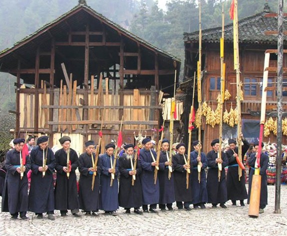 貴客進(jìn)郎德上寨得按苗家禮俗喝攔路酒。從寨腳公路開始,到寨頭的進(jìn)寨門樓,設(shè)迎客攔路酒卡,多達(dá)12道。每道酒卡,在路中間放一張方桌,兩邊站著幾個身著盛裝的苗族男女青年,提壺端杯,向客人敬酒,每道兩土碗,表示福壽雙全。最后一道酒卡是進(jìn)寨門樓,土碗換成了大牛角。如此一路想滿飲進(jìn)寨者,非“海量”莫能。不過不善飲酒的客人也不必?fù)?dān)心,只要你雙手背在身后,彎腰用唇輕觸酒杯即離,并有禮貌他說一聲“兜社莫”(苗語“謝謝你”)就可以“過關(guān)”了。主人雖然好客,但絕不會強(qiáng)人所難。歡迎儀式還有燃鐵炮、放鞭炮、奏莽筒、唱酒歌等。在這之后,婦女們身穿繡衣條裙,頭戴銀角冠,男子們則長袍馬褂,全村盡出,把客人引至寨中心蘆簽場。場上銅鼓高懸,青年鄉(xiāng)民在這里為客人獻(xiàn)上傳統(tǒng)的苗族歌舞:蘆笙舞、板凳舞、木鼓舞,銅鼓舞……最后,全村男女老少絡(luò)繹上場,圍成若干個同心圓,隨著銅鼓點(diǎn)子款款繞場起舞,客人們也被邀入場內(nèi),使狂歡活動達(dá)到高潮。歌舞之后,可信步走人普通苗家,那“吱呀”的紡車,“嚓嚓”的布機(jī),講述著大山中寧靜的生活,熱情的村民定會邀你在吃新節(jié)或過苗年時再來,那是他們最隆重的節(jié)日。