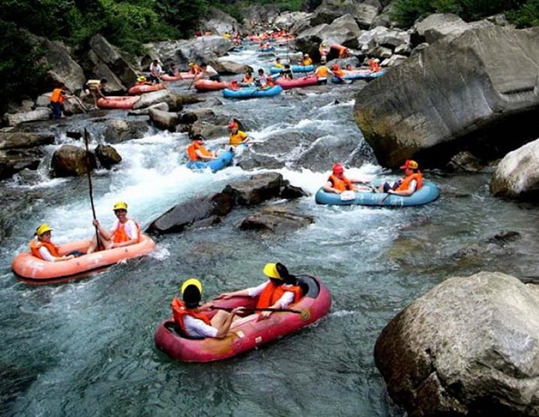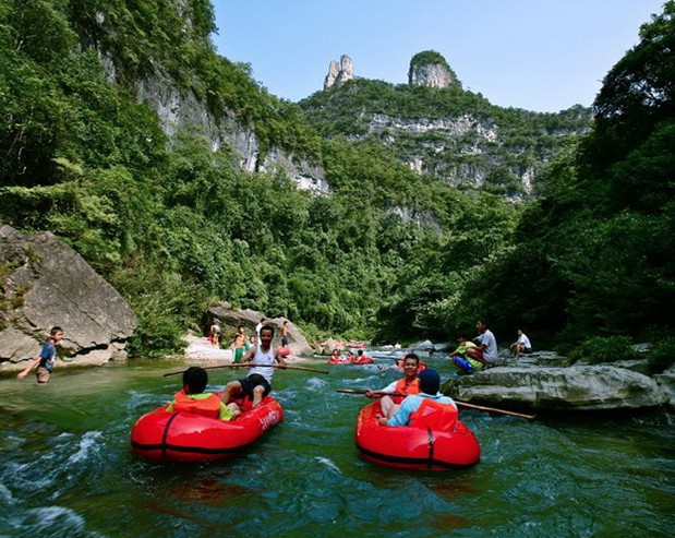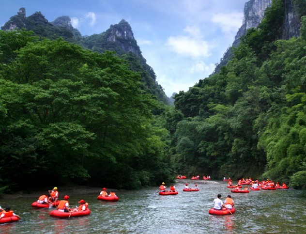 杉木河兩岸,山巖形狀多樣。在杉木河峽谷中漂流的人們便來了擬物象形的興致,每每見到凌空而架、造型獨特的一個天然石拱,學(xué)生物學(xué)的叫它“尺蠖洞”,好老莊的叫它“迎仙洞”,搞地質(zhì)研究的叫它“天生橋”;見到崖畔上陡大的石柱,有航海經(jīng)歷的稱其為“林海燈塔”,學(xué)歷史的稱其為“烽臺”??傊?,每一景致都引來千般說道,樂山樂水,見仁見智,真?zhèn)€是莫衷一是。杉木河床為卵石細沙鋪地,流水晶洼碧透,順著寬綽的河道款款流淌。沿途云飄山際,鷺?biāo)奚持?,魚翔淺底,蟬鳴林梢,奇草溢芳,整個環(huán)境幽而不險,郁而不閉。倘若有七八十歲的老翁老嫗乘上橡皮舟,只要有船工撐篙定可安然漂流而下;而逞能的姑娘在過灘時如被飛濺的浪花嚇得掉入水中,即刻就會有健壯的手臂向她揮來——當(dāng)然這并不排除同舟的小伙子惡作劇,創(chuàng)造“英雄救美”機會的可能。其實遇到此種情形即使落下河喝上幾口水也井非壞事,當(dāng)自己掙扎著站穩(wěn)腳跟就會發(fā)現(xiàn)河水正泠泠地從大腿間流過,瞧那水要多清有多清要多純凈有多純凈,絕無任何污染。版權(quán)所有山東聊城聊之旅國際旅行社有限公司,轉(zhuǎn)載必究!何況還會從虛驚中多了一分體驗一分得意,難怪一位游客要戲稱“不到浪中翻個滾,哪知杉水是甜泉”。誰要有興趣就停船登岸,到山中采來竹筍,下水中捕捉魚蝦螃蟹,搭起帳篷點燃篝火,入夜后伴以流水蛙鳴,舉杯同邀倩風(fēng)明月,享大自然寬厚、質(zhì)樸、醇美的恩賜。這對于飽受城市喧囂和環(huán)境污染之苦的人來說,簡直是一方勝境。在2009年由《行游天下》雜志社、搜狐旅游、中國旅游胡同社區(qū)等媒體聯(lián)合推出的“中國最美旅游勝地排行榜”評選活動中,杉木河漂流入選中國最驚險刺激的六大漂流勝地。