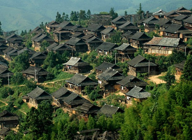 岜沙苗族部落僅2000余人,分住在貴州省從江縣城南6公里處月亮山麓茫然林海中的5個寨子里。走進岜沙,隨處可見茂密的森林。他們以稻作為主,狩獵為伴。這里箐黑林密,鳥道蠶叢,具有很強的隱蔽性,千百年來極少有外人進入。岜沙村不大,村寨建于山粱坳口及面向都柳江一側(cè)的半坡上。村寨木樓古樸、簡單;四周則為密林環(huán)繞,環(huán)境幽雅;村民全系苗族,衣著傳統(tǒng),發(fā)勢奇特。