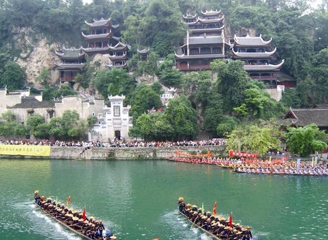 青龍洞古建筑群坐落在中國歷史文化名城——鎮(zhèn)遠城東的中和山上。這里山勢挺拔,峭壁懸崖。巨巖、洞穴和為一體。道、儒、佛三種宗教的寺廟群生就山腰。它背靠青山,面臨綠水,貼壁臨空,五步一樓,十步一閣,翹翼飛檐、雕梁畫棟。這些古建筑依山因地,分別采用了“吊”、“借”、“附”、“嵌”、“筑”等多種工藝,硬是在一段懸崖上筑出中元洞、紫陽洞、青龍洞、萬壽宮等一片閣樓洞天。