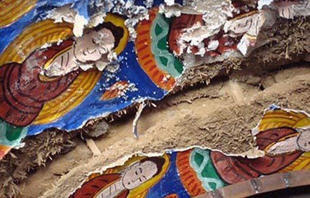 吉木薩爾千佛洞坐落在天山北麓距吉木薩爾縣城西南5km的黃土崗上,向北有小路與烏奇公路相通,交通便利.千佛洞建筑呈東西向的長方形,東面有山門。正殿坐西朝東,土木結(jié)構(gòu),南北兩則建有配房,磚木建筑。正殿為一有斗拱的硬山頂建筑,分前、中、后堂三部分。前堂塑有丈許高的釋加佛像一尊,中堂面闊三間,繪有佛說法圖,18羅漢等塑像;后堂塑有臥佛一尊;三部分緊密相連,構(gòu)成一個(gè)整體。
