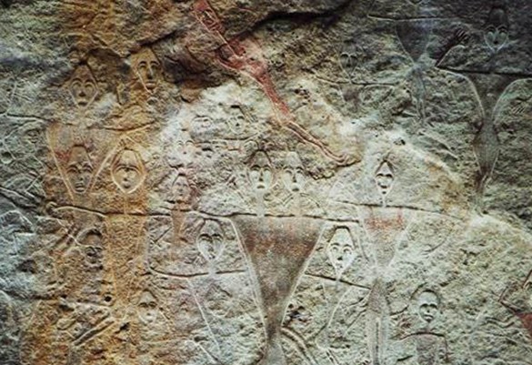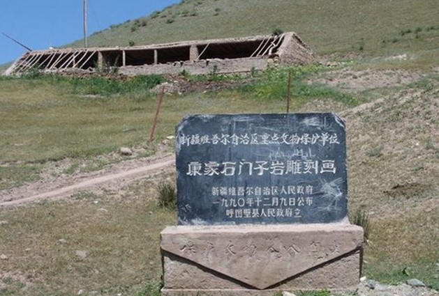 康家石門子巖雕刻畫是一幅國(guó)內(nèi)及世界上罕見(jiàn)的生殖崇拜巖畫。位于昌吉州呼圖壁縣的天山腹地, 兩條山溪匯流處的西北岸的新第三紀(jì)的粉砂巖壁上。巖面平整,距地表約10米上下。畫面東西長(zhǎng)14米,上下高9米多,整個(gè)面積達(dá)120平方米左右。上面刻繪著二三百個(gè)大小不等,身姿各異的人物和動(dòng)物。大者高 2.04米,小者19厘米。有男有女,或站或臥,或衣或裸,男女合圖、雙頭同體、三頭同體圖像。巖畫采用淺浮雕的手法,所雕人物的面部均面型瘦長(zhǎng),眉弓發(fā)育,大眼、高鼻、小嘴,形象秀麗。頭戴高帽,帽著翎毛,作舞蹈狀。相當(dāng)數(shù)量的畫面顯示或隱喻了男女交媾的動(dòng)作。在此圖像下還刻繪了成排的小人在歡快舞蹈的場(chǎng)面,以表現(xiàn)祈求子嗣繁衍、人丁興旺的愿望。真實(shí)地體現(xiàn)了原始人祈求生育、繁衍人口的群婚制生活場(chǎng)面。