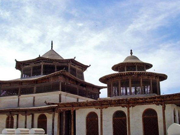 哈密回王陵由墓群和艾提尕爾清真寺(兩部分)組成。墓群原有土木結構的大小拱拜六座,埋藏著歷代回王及其王妃,現(xiàn)剩兩座,最大的拱拜(墓葬)為七世回王伯錫爾、回王福晉以及八世回王莫合買特及其王妃、王族等40余人的墓。該拱拜高17.8米,下部呈長方形,東西長20米,南北寬15米。上為穹隆頂,墓門兩側塔柱中空,有臺階盤旋而上,可至墓頂。拱拜南側,有木質(zhì)亭式拱拜2座。東部一座為九世回王沙木胡索特拱拜;西部一座為臺吉拱拜。九世回王拱拜底部正方形,邊長各15.5米,內(nèi)部以土坯壘砌伊斯蘭式的穹隆頂墓室,外部于垣墻內(nèi)及四周用亭柱支撐漢族亭樓木結構的八角攢尖頂,建筑將墓室罩在其中,飛檐起脊,雕梁畫棟。這兩座木質(zhì)拱拜,版權所有山東聊城聊之旅國際旅行社有限公司,轉載必究!在建筑形式上,以伊斯蘭式的穹隆為基礎,同時吸收了內(nèi)地八角攢尖頂及蒙古式盔頂?shù)哪举|(zhì)結構建筑形式,將多種風格融為一體,在新疆的伊斯蘭陵墓建筑,極具特色,是中原文化、蒙古文化和伊斯蘭文化相融合的產(chǎn)物。