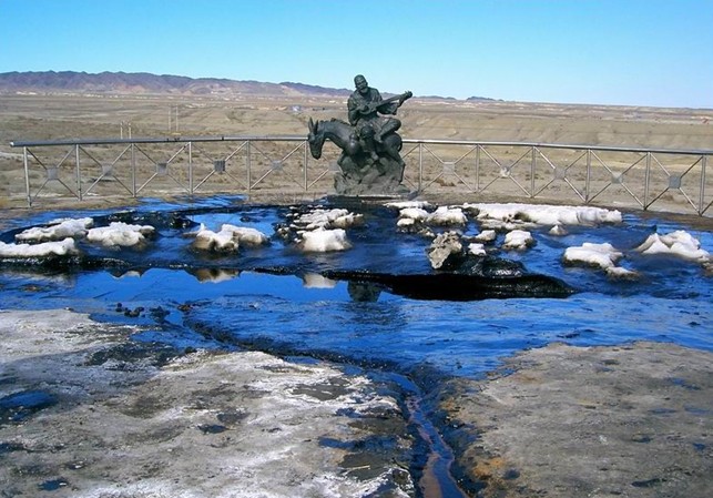 黑油山位于克拉瑪依東北部,距市中心兩公里多,是油田重要油苗露頭的地方,因原油長(zhǎng)年外溢結(jié)成一群瀝青丘,最大的一個(gè)高13米,面積0.2平方公里,油質(zhì)為珍貴低凝油。"克拉瑪依” 維吾爾語(yǔ)為“黑油”,故這個(gè)天然石油瀝青丘且得名黑油山。這座黑色的瀝青山以及它地下埋藏的石油在這里已沉睡上億年。由于地殼變動(dòng),巖石產(chǎn)生斷裂破碎,地下石油受地層壓力影響,巖石裂隙不斷向地表滲出,石油中輕質(zhì)部分揮發(fā),剩下稠液同沙土凝結(jié)堆成此黑油山,由于周圍荒涼的惡劣環(huán)境,千百年來(lái)它不被人們重視。直到解放前,一位叫塞里木巴依的維吾爾老人,第一次叩響了黑油山大門,他在山旁搭了個(gè)地窩子,在集油洼地?fù)迫≡停T毛驢往返于烏蘇與黑油山間,用黑色的油換取生活用品,當(dāng)?shù)厝擞么嗽忘c(diǎn)燈,膏車軸等。為發(fā)揚(yáng)艱苦創(chuàng)業(yè)精神,版權(quán)所有山東聊城聊之旅國(guó)際旅行社有限公司,轉(zhuǎn)載必究!新疆石油管理局和克拉瑪依市1982年10月1日在黑油山樹立了近3米高的石雕紀(jì)念碑和一尊維吾爾老人騎著毛驢彈奏熱瓦普的塑像。1983年建成從礦史陳列館通往黑油山的瀝青混凝土公路及停車場(chǎng),到達(dá)山頂?shù)氖A也建成。 黑油山已成為各族人民進(jìn)行革命傳統(tǒng)教育的紀(jì)念地和游覽勝地。