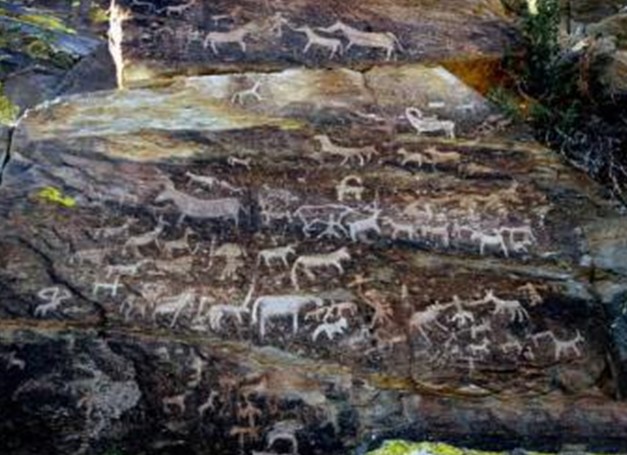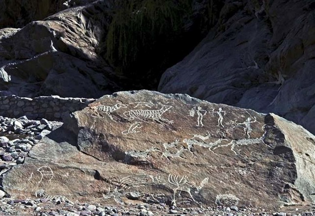 垂吉爾塔格山巖畫(huà),位于托克遜縣城西北55公里處。在十幾、二十公里長(zhǎng)的柯?tīng)柤右罍系纳角鹗诨驂嬄涞耐咙S色砂巖上,分布著數(shù)十幅栩栩如生、形態(tài)各異的古代巖畫(huà)。巖畫(huà)有放牧、狩獵和引水灌溉等圖案,以動(dòng)物為主,有鹿、駱駝、豹、虎、狼、狗,最多的是大角羊。 畫(huà)中人物或行或立,或射箭或騎駱駝,他們頭戴大皮帽,腳穿長(zhǎng)腰靴,腰部束帶,雄姿勃發(fā)。垂吉爾塔格山巖畫(huà)線條流暢,稀疏均勻,布局合理,鑿刻技藝高超,真實(shí)地反映了古代人生活放牧的情景,是新石器時(shí)代的作品。垂吉爾塔格山水系石刻圖距柯?tīng)柤右梨?zhèn)西北5公里柯?tīng)柤右罍衔靼兜耐咙S色砂巖上,有一幅當(dāng)今世界上最早的水系石刻圖,它就是垂吉爾塔格山水系石刻圖。