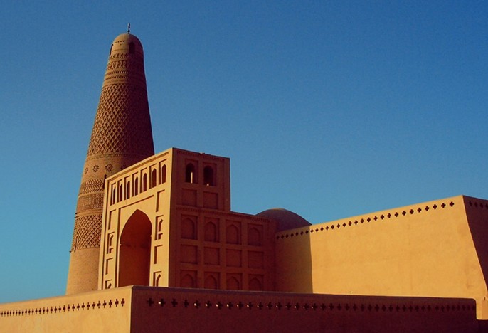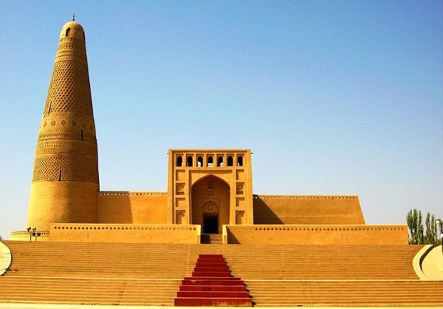 額敏塔,全稱為額敏和卓報恩塔,又稱蘇公塔,當?shù)鼐S吾爾群眾稱之為吐魯番塔,高高矗立于吐魯番市區(qū)東南2公里處,是新疆現(xiàn)存最大的古塔,也是我國百座名塔中唯一一座伊斯蘭風格的古塔,1985年列為國家重點文物保護單位。額敏塔坐落在新疆吐魯番市葡萄鄉(xiāng)木納爾村南面的一處開闊臺地上,西距吐魯番2公里,東面與安樂古城相鄰。