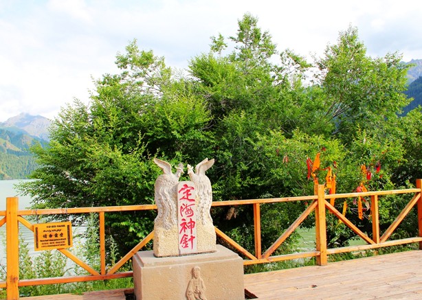 定海神針是天池周圍方圓幾公里內(nèi)唯一的一棵榆樹,也是海拔最高的一棵樹。在天池湖岸邊有一棵郁郁蔥蔥,枝繁葉茂,傲然獨(dú)立的大榆樹,這就是天池八景之一的“定海神針”。神話傳說(shuō):相傳當(dāng)年王母娘娘開蟠桃盛會(huì),廣邀各路神仙,唯獨(dú)忘了邀請(qǐng)瑤池水怪。席間水怪興風(fēng)作浪,王母娘娘怒不可遏,拔下頭上的一枚碧玉簪,擲入水中降服水怪。