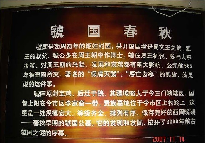 虢國(guó)是西周初年的姬姓封國(guó)。其開(kāi)國(guó)國(guó)君是周文王之弟,武王的叔父。虢公多在周王朝中作卿士,輔佐周王征伐,參與大事決策,對(duì)周王朝的興起、發(fā)展和衰落都有重大影響。公元前655年被晉國(guó)所滅,著名的"假虞滅虢"、"唇亡齒寒"的典故,就是說(shuō)的這件事。