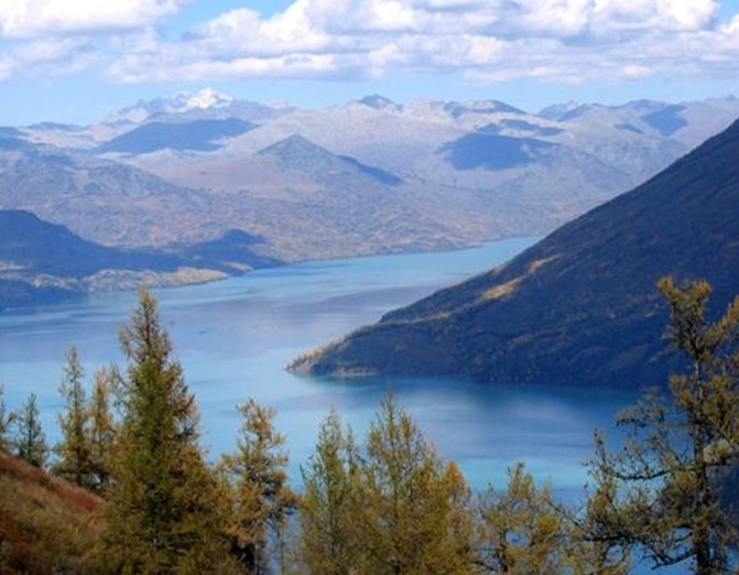 湖面呈北西向狹長的彎月狀展布,長約13km,寬1~3km,面積約9.3km2,最大湖深7.5m,平均湖深2.0m,容積約4.0×107m3。由8個小湖泊相連組成,湖水為無色透明的淡水,礦化度1~2g/L,PH值8。湖水夏季水溫17℃,冬季結(jié)冰,最厚處40cm。湖區(qū)年平均氣溫9.9℃,1月平均氣溫-9.0℃,極端低溫-27.6°C,7月平均氣溫 23.8℃,極端高溫40.7℃,年降水量60.8mm,蒸發(fā)量1896.5mm。主導風向西北,最大風速20m/s。每年12月初湖水開始結(jié)冰,解凍期為翌年3月中旬。5月初至 10月底為旅游季節(jié)。