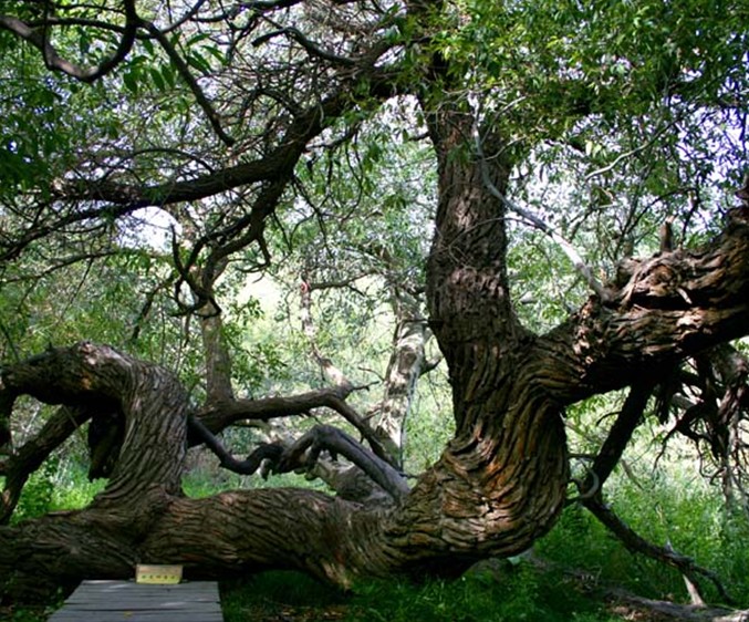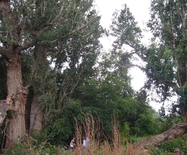 阿克蘇向北,過(guò)溫宿縣城后,再向西北行60公里,穿越一大片戈壁灘,一個(gè)崗巒起伏的小綠洲便展現(xiàn)面前。這個(gè)小綠洲,不是處在地勢(shì)低洼處,而是位于坡度平緩的崗阜上,海拔為1700米左右,面積僅0.4平方公里,但卻是郁郁蔥蔥,濃蔭覆蓋,流水潺潺,蜂飛蝶舞,堪稱人間仙景。當(dāng)?shù)胤Q它為“怪樹(shù)園”。被稱之為“圣水泉”的一汪清泉在綠洲頂部,涓涓細(xì)流,滋潤(rùn)著這塊綠洲。
