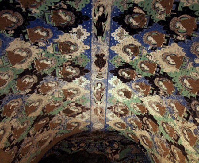 再往后到了公元6-7世紀(jì),為其繁盛期,目前石窟中一半都是屬于這個(gè)時(shí)期建筑而成的,造像普遍采用金粉或金箔敷貼。在此方形窟中因緣畫較為突出.建筑上以大型中心柱居多。因緣故事就是記釋迦加牟尼成佛后,云游四方,傳播佛法,常以因緣故事喻人,就產(chǎn)生了因緣故事,傳播因果輪回之說。大家看這個(gè)第8窟的菱格因緣圖,上畫的是猴子奉蜜于佛,佛云有蟲,猴去蟲又奉之,又曰太濃,猴就加泉水以稀之,再奉,佛和眾弟子飲了,猴很開心,一高興跌入水坑淹死了,因前身奉過佛,來生生于富貴人家做了富人,此類因緣故事在石窟中有100多種上千幅,但內(nèi)容較難識(shí)辨,其種類數(shù)量卻屬國內(nèi)罕見。